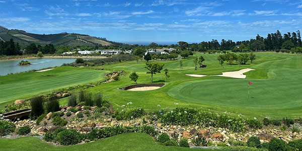 Featured Hole: 17th – one of the most daunting tee shots in the Cape, over the crest of a ridge with a fence on the right separating the estate from a nature reserve. The fairway is framed by pine trees on the left and out of bounds on the right